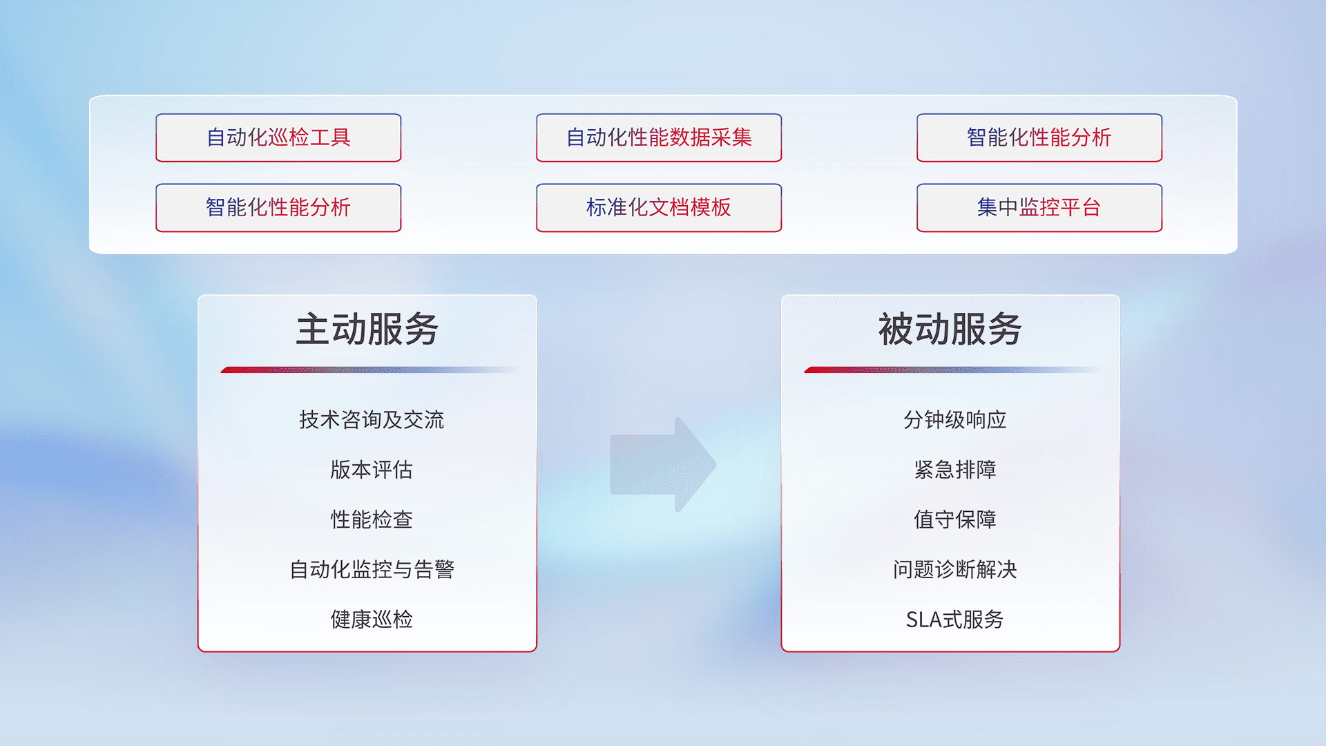 智能化工具和标准化文档,,,保障服务质量,,,提供主动服务(包含技术咨询、、、版本评估、、、性能检查、、、、自动化监控与告警、、健康巡检)和被动服务包含(分钟级响应、、、紧急排障、、、、值守保障、、问题诊断解决、、SLA服务)。。。。